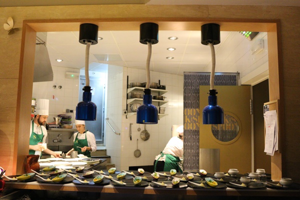 Restoranda 2 bölüm var. Biz mutfağı direk karşıdan gören yüksek sandalyeli bölümde otururken, sağ tarafımızda ise kalabalık masalar vardı. Kalabalık derken, restoranın en fazla 30 kişilik olduğunu da söylemek gerekir.